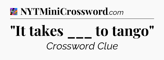 You’ve come to our website, which offers answers for the Crosswords With Friends Midi game. Earlier or later you will need help to pass this challenging game and our website is here to equip you with “It takes ___ to tango” Crossword Clue answers and other useful information like tips, solutions and cheats. Just use this page and you will quickly pass the level you stuck in the Crosswords With Friends Midi game. Besides this game Zynga has created also other not less fascinating games.