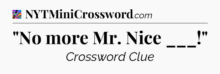 This page will help you find the correct answer to the ‘”No more Mr. Nice ___!”‘ clue from Crosswords With Friends. If you’re stuck, simply scroll down to see the solution. We also provide extra answers, helpful hints, and tips to make solving Crosswords With Friends easier and more enjoyable. Use this resource anytime you need quick assistance with tough clues!