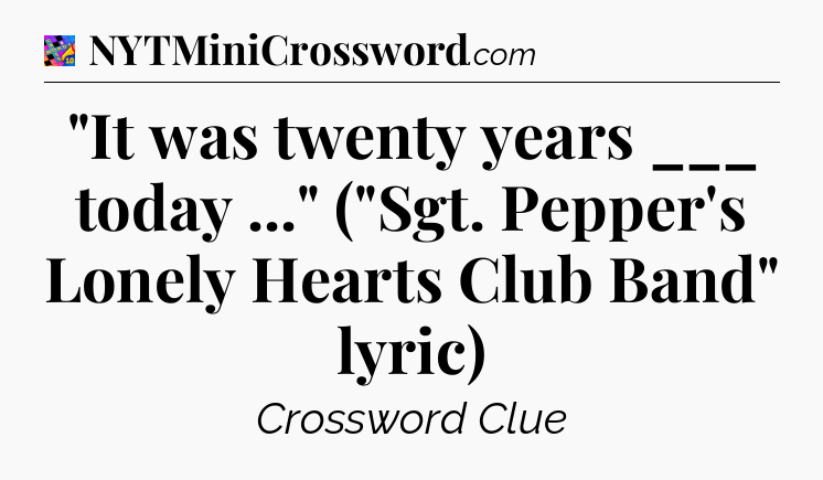 This page will help you find the correct answer to the ‘”It was twenty years ___ today …” (“Sgt. Pepper’s Lonely Hearts Club Band” lyric)’ clue from Crosswords With Friends. If you’re stuck, simply scroll down to see the solution. We also provide extra answers, helpful hints, and tips to make solving Crosswords With Friends easier and more enjoyable. Use this resource anytime you need quick assistance with tough clues!