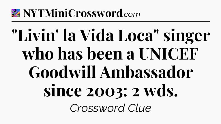 The clue “”Livin’ la Vida Loca” singer who has been a UNICEF Goodwill Ambassador since 2003: 2 wds” most recently appeared in a Crosswords With Friends on April 18, 2026.