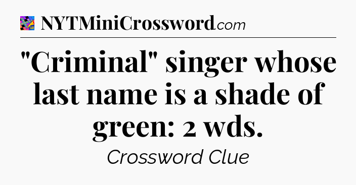 This page will help you find the correct answer to the ‘”Criminal” singer whose last name is a shade of green: 2 wds’ clue from Crosswords With Friends. If you’re stuck, simply scroll down to see the solution. We also provide extra answers, helpful hints, and tips to make solving Crosswords With Friends easier and more enjoyable. Use this resource anytime you need quick assistance with tough clues!