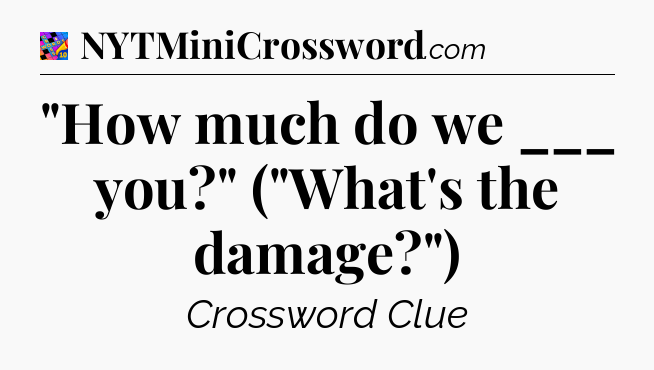 This page will help you find the correct answer to the ‘”How much do we ___ you?” (“What’s the damage?”)’ clue from Crosswords With Friends. If you’re stuck, simply scroll down to see the solution. We also provide extra answers, helpful hints, and tips to make solving Crosswords With Friends easier and more enjoyable. Use this resource anytime you need quick assistance with tough clues!