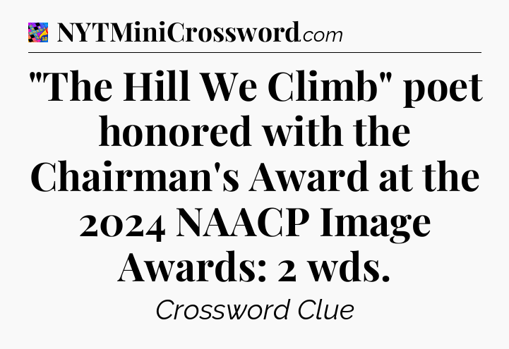 The clue “”The Hill We Climb” poet honored with the Chairman’s Award at the 2024 NAACP Image Awards: 2 wds” most recently appeared in a Crosswords With Friends on June 28, 2025.