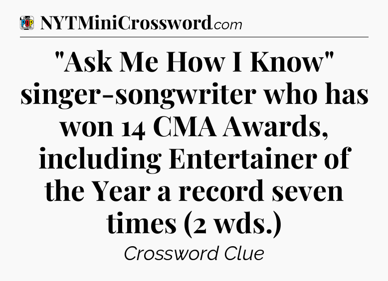 The clue “”Ask Me How I Know” singer-songwriter who has won 14 CMA Awards, including Entertainer of the Year a record seven times (2 wds.)” most recently appeared in a Daily Pop Crossword on December 30, 2025.
