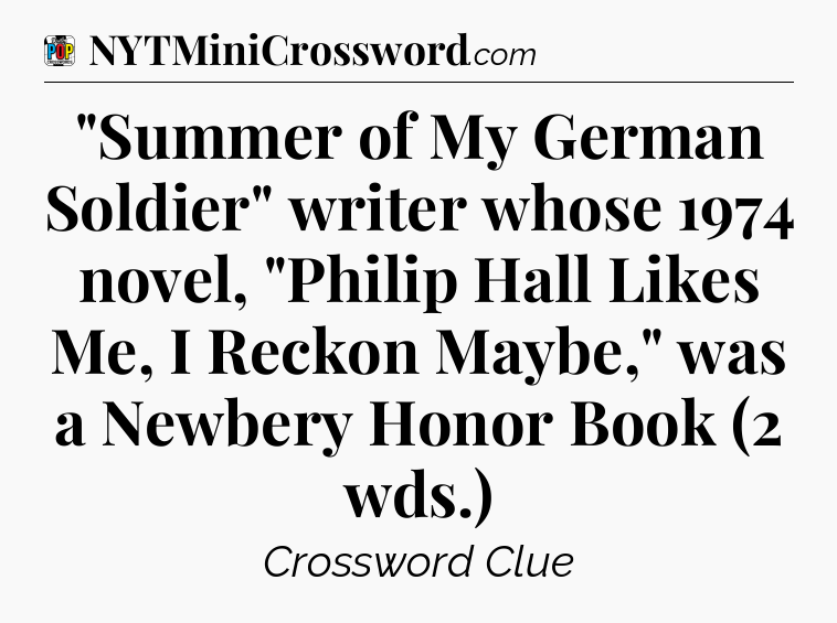 The clue “”Summer of My German Soldier” writer whose 1974 novel, “Philip Hall Likes Me, I Reckon Maybe,” was a Newbery Honor Book (2 wds.)” most recently appeared in a Daily Pop Crossword on February 11, 2024.