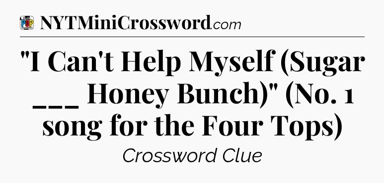 You’ll be glad to know, that your search for tips for Daily Pop Crossword game is ending right on this page. On this page we are posted for you “I Can’t Help Myself (Sugar ___ Honey Bunch)” (No. 1 song for the Four Tops) Crossword Clue answers, cheats, walkthroughs and solutions. This game was created by a PuzzleNation team that created a lot of great games for Android and iOS.