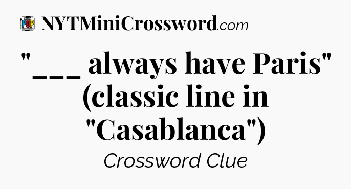 You’ll be glad to know, that your search for tips for Daily Pop Crossword game is ending right on this page. On this page we are posted for you “___ always have Paris” (classic line in “Casablanca”) Crossword Clue answers, cheats, walkthroughs and solutions. This game was created by a PuzzleNation team that created a lot of great games for Android and iOS.