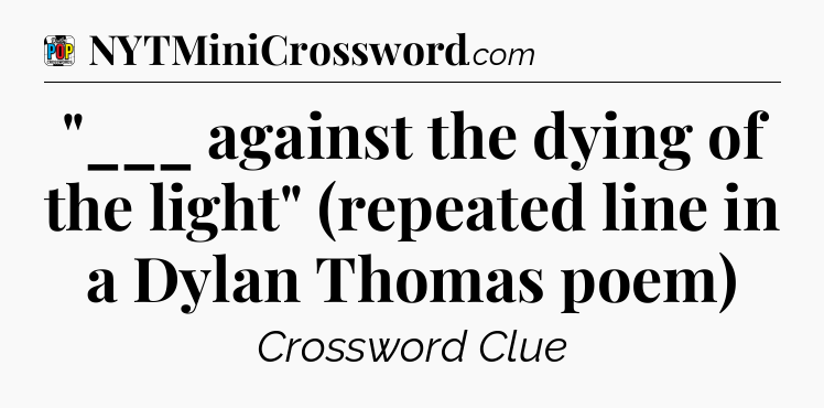 The Answer for “___ against the dying of the light” (repeated line in a Dylan Thomas poem) Crossword Clue is: