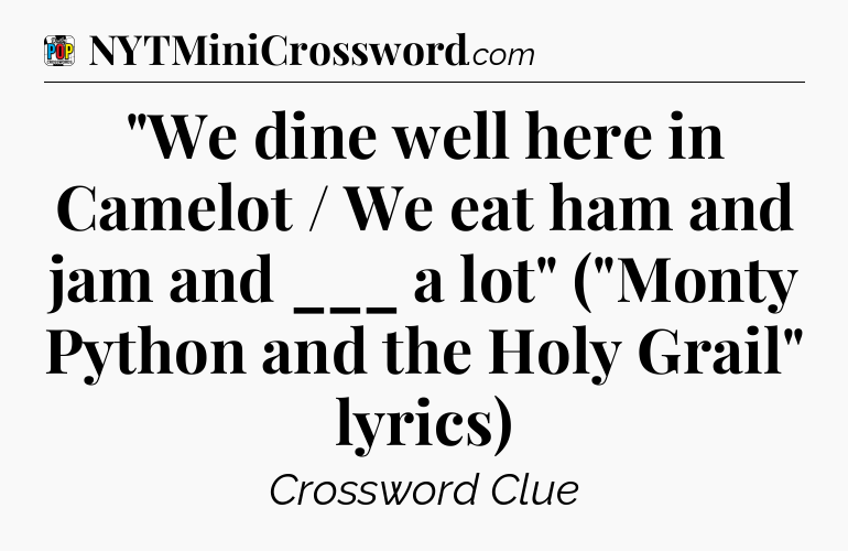 Many people are looking for this kind of information, because they want to pass each level. Especially for this we guessed Daily Pop Crossword “We dine well here in Camelot / We eat ham and jam and ___ a lot” (“Monty Python and the Holy Grail” lyrics) answers for you and placed on this website.