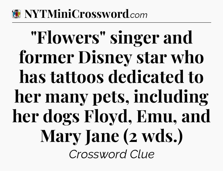 The clue “”Flowers” singer and former Disney star who has tattoos dedicated to her many pets, including her dogs Floyd, Emu, and Mary Jane (2 wds.)” most recently appeared in a Daily Pop Crossword on September 3, 2024.