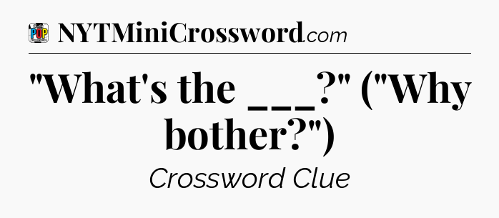 The clue “”What’s the ___?” (“Why bother?”)” most recently appeared in a Daily Pop Plus Crossword on August 21, 2025.