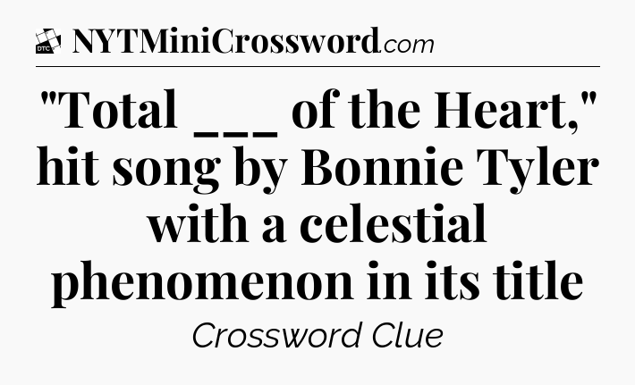 The clue “”Total ___ of the Heart,” hit song by Bonnie Tyler with a celestial phenomenon in its title” most recently appeared in a Daily Themed Classic Crossword on October 3, 2023.