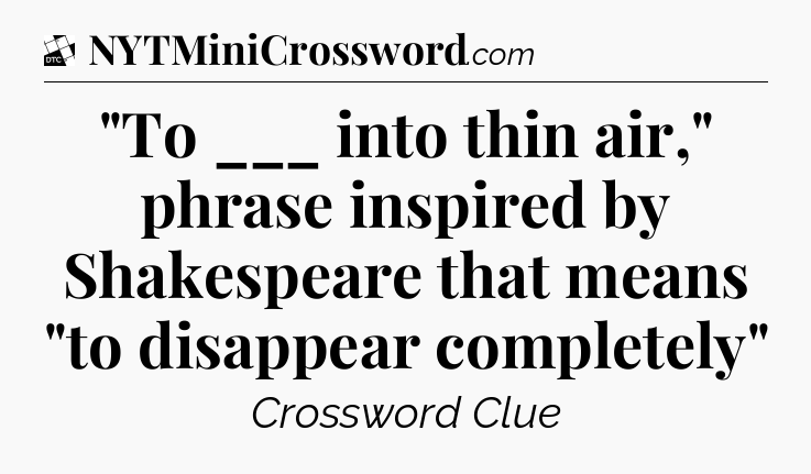 The clue “”To ___ into thin air,” phrase inspired by Shakespeare that means “to disappear completely”” most recently appeared in a Daily Themed Classic Crossword on October 3, 2024.