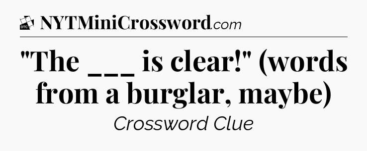 The clue “”The ___ is clear!” (words from a burglar, maybe)” most recently appeared in a Daily Themed Classic Crossword on March 30, 2023.
