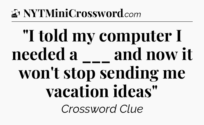 The clue “”I told my computer I needed a ___ and now it won’t stop sending me vacation ideas”” most recently appeared in a Daily Themed Classic Crossword on May 11, 2025.