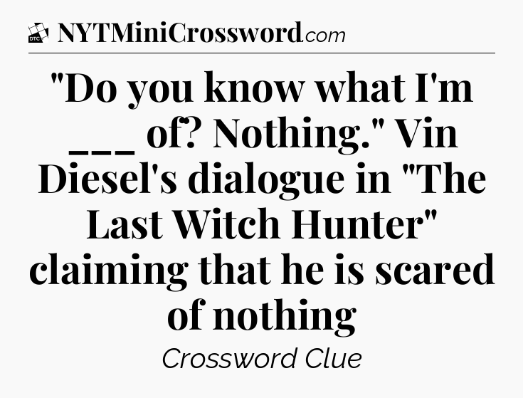 The clue “”Do you know what I’m ___ of? Nothing.” Vin Diesel’s dialogue in “The Last Witch Hunter” claiming that he is scared of nothing” most recently appeared in a Daily Themed Classic Crossword on July 18, 2024.