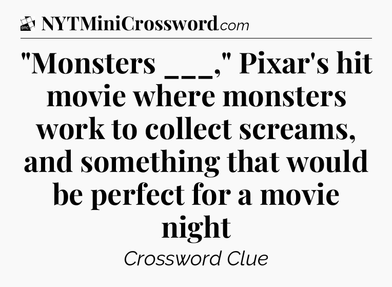 The Answer for ‘”Monsters ___,” Pixar’s hit movie where monsters work to collect screams, and something that would be perfect for a movie night’ Crossword Clue is: