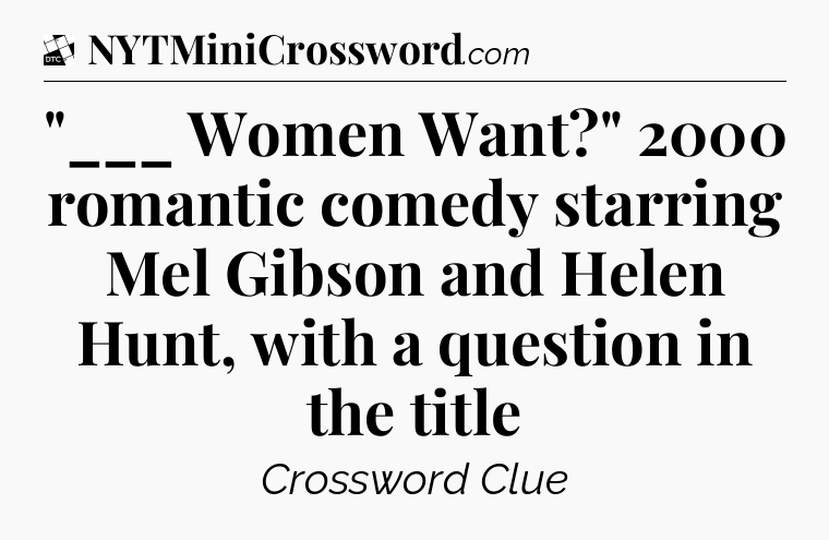 The clue “”___ Women Want?” 2000 romantic comedy starring Mel Gibson and Helen Hunt, with a question in the title” most recently appeared in a Daily Themed Classic Crossword on September 26, 2024.