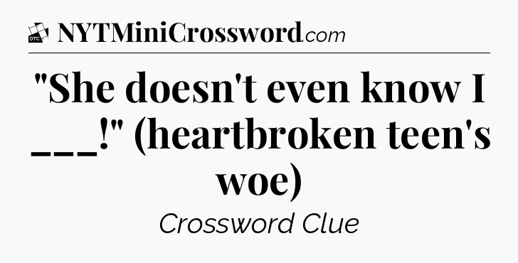 The clue “”She doesn’t even know I ___!” (heartbroken teen’s woe)” most recently appeared in a Daily Themed Crossword on May 28, 2023.