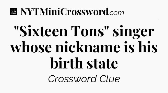 The clue “”Sixteen Tons” singer whose nickname is his birth state” most recently appeared in a LA Times Crossword on October 31, 2021.
