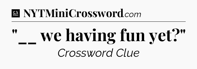 The clue “”__ we having fun yet?”” most recently appeared in a LA Times Crossword on December 14, 2021.