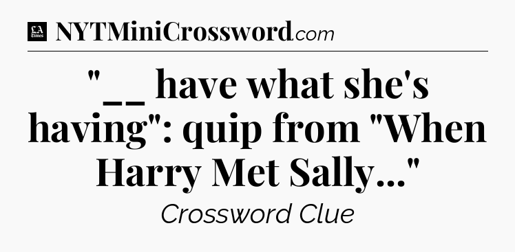 The clue “”__ have what she’s having”: quip from “When Harry Met Sally…”” most recently appeared in a LA Times Crossword on March 4, 2021.