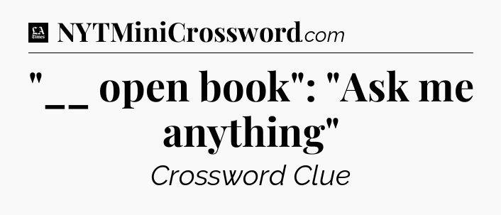 The clue “”__ open book”: “Ask me anything”” most recently appeared in a LA Times Crossword on April 26, 2022.