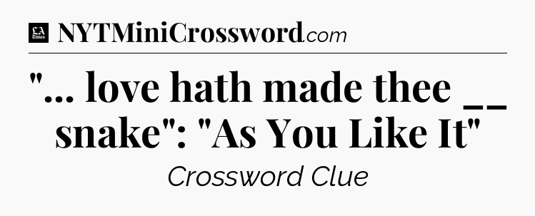 The clue “”… love hath made thee __ snake”: “As You Like It”” most recently appeared in a LA Times Crossword on May 4, 2017.