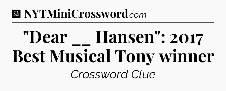 The clue “”Dear __ Hansen”: 2017 Best Musical Tony winner” most recently appeared in a LA Times Crossword on June 20, 2022.