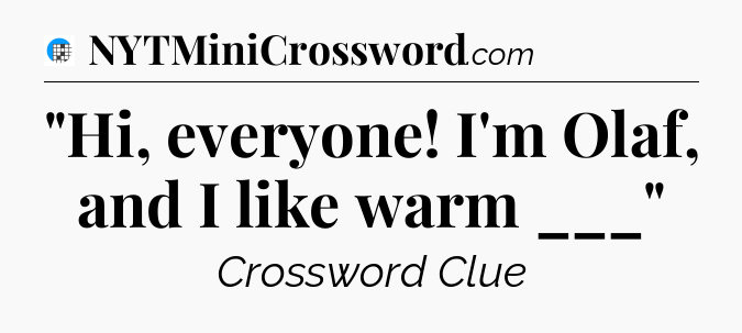 The clue “”Hi, everyone! I’m Olaf, and I like warm ___”” most recently appeared in a USA Today Crossword on January 23, 2024.