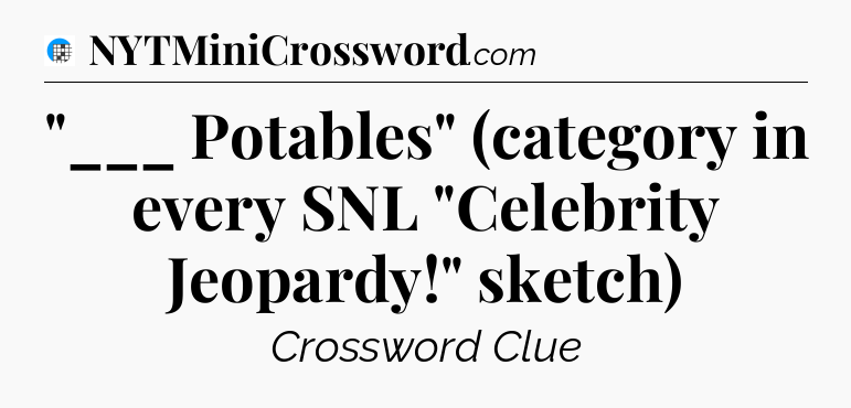 There is 1 possible answer for the crossword clue “”___ Potables” (category in every SNL “Celebrity Jeopardy!” sketch)”.