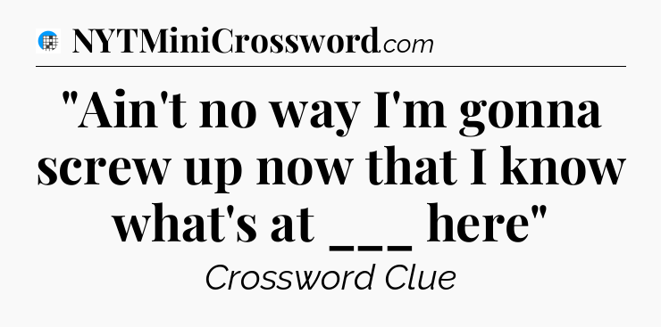 The clue “”Ain’t no way I’m gonna screw up now that I know what’s at ___ here”” most recently appeared in a USA Today Crossword on November 9, 2025.