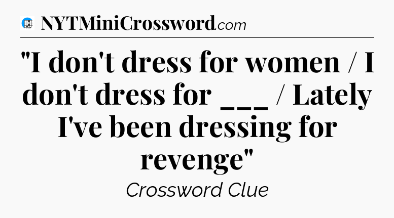 The clue “”I don’t dress for women / I don’t dress for ___ / Lately I’ve been dressing for revenge”” most recently appeared in a USA Today Crossword on June 22, 2025.
