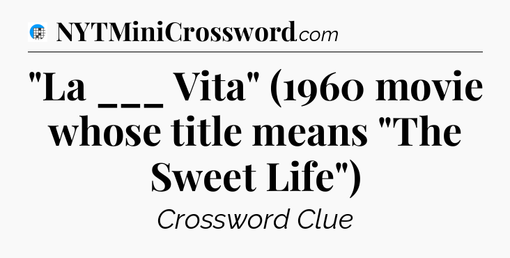 The correct answer to the crossword clue “”La ___ Vita” (1960 movie whose title means “The Sweet Life”)” is DOLCE.