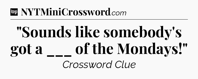 You’ve come to our website, which offers answers for the Washington Post Sunday Crossword game. With this website, you will not need any other help to pass difficult task or level. It helps you with “Sounds like somebody’s got a ___ of the Mondays!” crossword clue answers, some additional solutions and useful tips and tricks. The team that named The Washington Post, which has developed a lot of great other games and add this game to the Google Play and Apple stores.