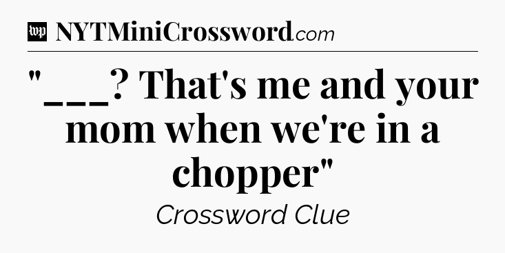 You’ve come to our website, which offers answers for the Washington Post Sunday Crossword game. With this website, you will not need any other help to pass difficult task or level. It helps you with “___? That’s me and your mom when we’re in a chopper” crossword clue answers, some additional solutions and useful tips and tricks. The team that named The Washington Post, which has developed a lot of great other games and add this game to the Google Play and Apple stores.