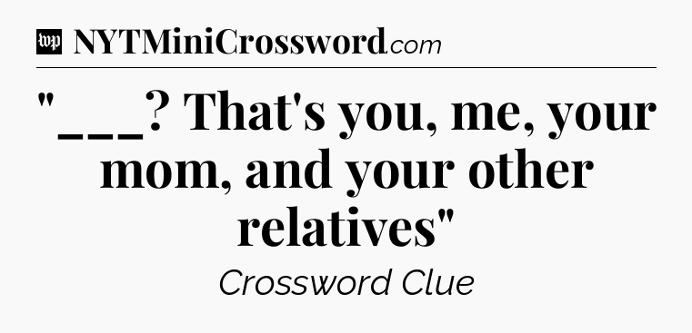 You’ve come to our website, which offers answers for the Washington Post Sunday Crossword game. With this website, you will not need any other help to pass difficult task or level. It helps you with “___? That’s you, me, your mom, and your other relatives” crossword clue answers, some additional solutions and useful tips and tricks. The team that named The Washington Post, which has developed a lot of great other games and add this game to the Google Play and Apple stores.