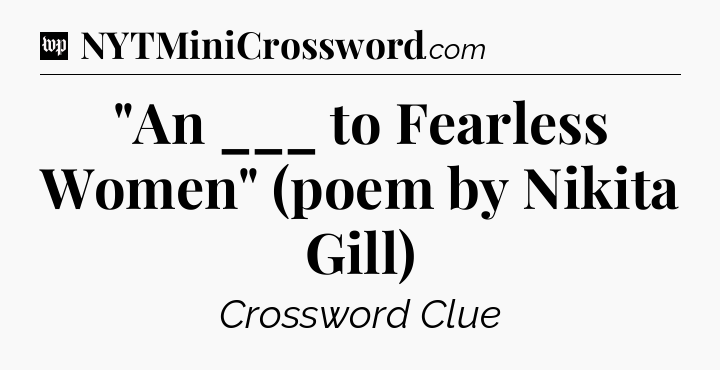 You’ve come to our website, which offers answers for the Washington Post Sunday Crossword game. With this website, you will not need any other help to pass difficult task or level. It helps you with “An ___ to Fearless Women” (poem by Nikita Gill) crossword clue answers, some additional solutions and useful tips and tricks. The team that named The Washington Post, which has developed a lot of great other games and add this game to the Google Play and Apple stores.