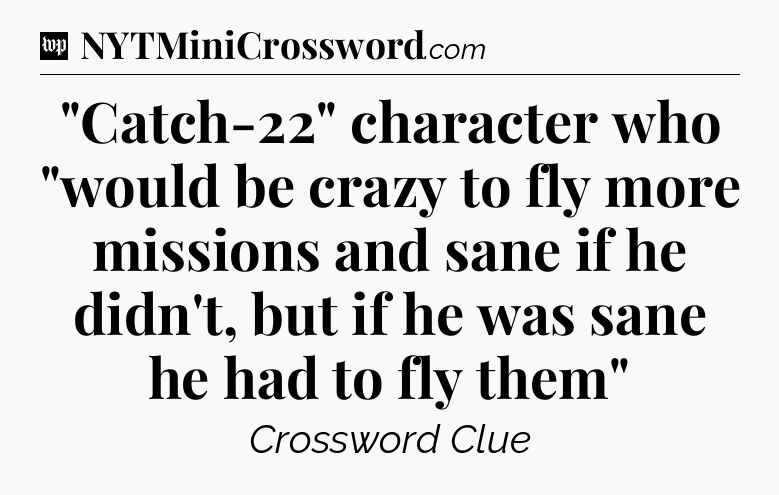 You’ve come to our website, which offers answers for the Washington Post Sunday Crossword game. With this website, you will not need any other help to pass difficult task or level. It helps you with “Catch-22” character who “would be crazy to fly more missions and sane if he didn’t, but if he was sane he had to fly them” crossword clue answers, some additional solutions and useful tips and tricks. The team that named The Washington Post, which has developed a lot of great other games and add this game to the Google Play and Apple stores.