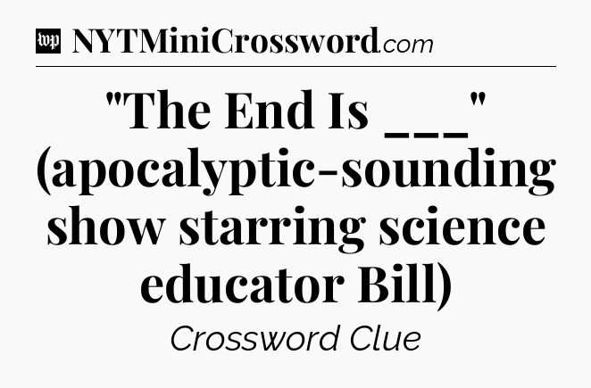 You’ve come to our website, which offers answers for the Washington Post Sunday Crossword game. With this website, you will not need any other help to pass difficult task or level. It helps you with “The End Is ___” (apocalyptic-sounding show starring science educator Bill) crossword clue answers, some additional solutions and useful tips and tricks. The team that named The Washington Post, which has developed a lot of great other games and add this game to the Google Play and Apple stores.