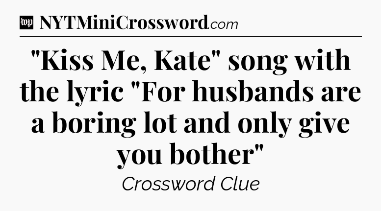 You’ve come to our website, which offers answers for the Washington Post Sunday Crossword game. With this website, you will not need any other help to pass difficult task or level. It helps you with “Kiss Me, Kate” song with the lyric “For husbands are a boring lot and only give you bother” crossword clue answers, some additional solutions and useful tips and tricks. The team that named The Washington Post, which has developed a lot of great other games and add this game to the Google Play and Apple stores.