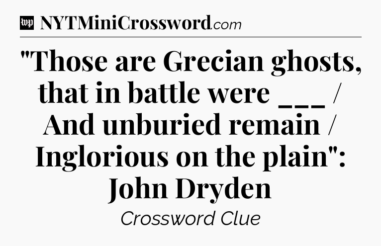 You’ve come to our website, which offers answers for the Washington Post Sunday Crossword game. With this website, you will not need any other help to pass difficult task or level. It helps you with “Those are Grecian ghosts, that in battle were ___ / And unburied remain / Inglorious on the plain”: John Dryden crossword clue answers, some additional solutions and useful tips and tricks. The team that named The Washington Post, which has developed a lot of great other games and add this game to the Google Play and Apple stores.