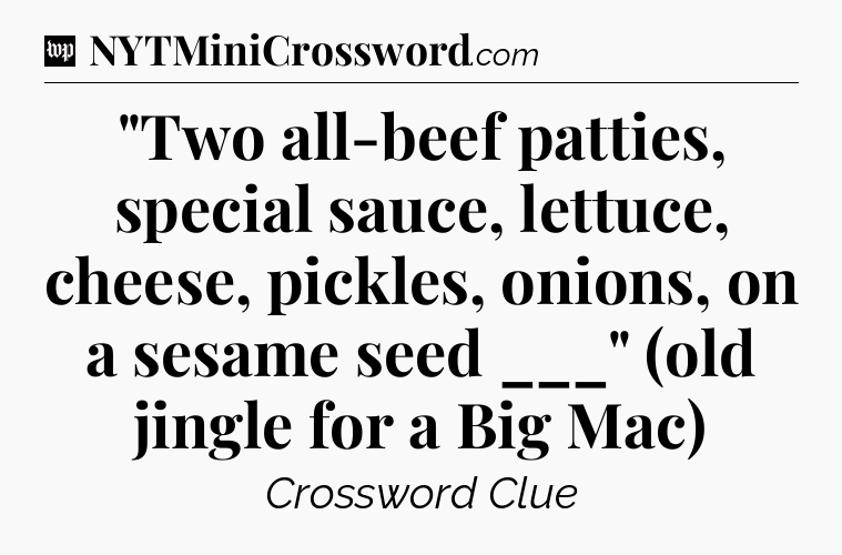 You’ve come to our website, which offers answers for the Washington Post Sunday Crossword game. With this website, you will not need any other help to pass difficult task or level. It helps you with “Two all-beef patties, special sauce, lettuce, cheese, pickles, onions, on a sesame seed ___” (old jingle for a Big Mac) crossword clue answers, some additional solutions and useful tips and tricks. The team that named The Washington Post, which has developed a lot of great other games and add this game to the Google Play and Apple stores.