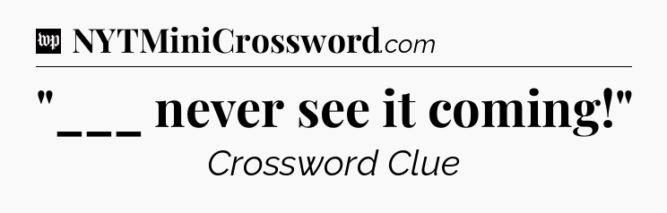 You’ve come to our website, which offers answers for the Washington Post Sunday Crossword game. With this website, you will not need any other help to pass difficult task or level. It helps you with “___ never see it coming!” crossword clue answers, some additional solutions and useful tips and tricks. The team that named The Washington Post, which has developed a lot of great other games and add this game to the Google Play and Apple stores.