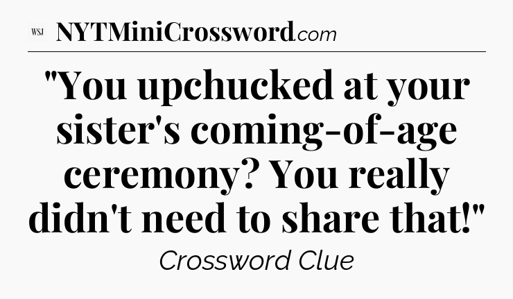 The clue “”You upchucked at your sister’s coming-of-age ceremony? You really didn’t need to share that!”” most recently appeared in a WSJ Crossword on January 27, 2024.