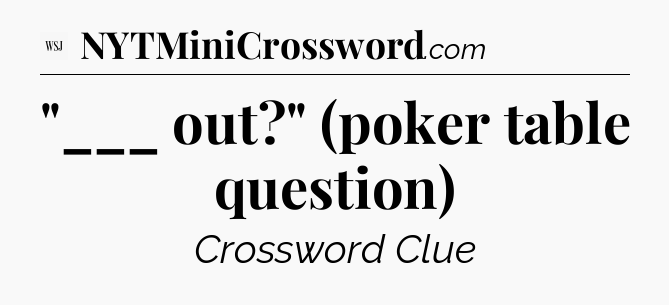 The clue “”___ out?” (poker table question)” most recently appeared in a WSJ Crossword on February 3, 2024.