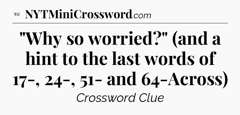 The clue “”Why so worried?” (and a hint to the last words of 17-, 24-, 51- and 64-Across)” most recently appeared in a WSJ Crossword on March 10, 2025.