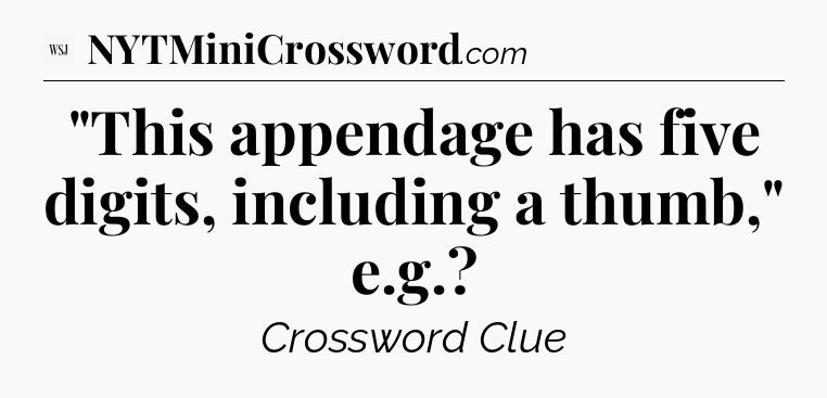 The clue “”This appendage has five digits, including a thumb,” e.g” most recently appeared in a WSJ Crossword on April 28, 2025.